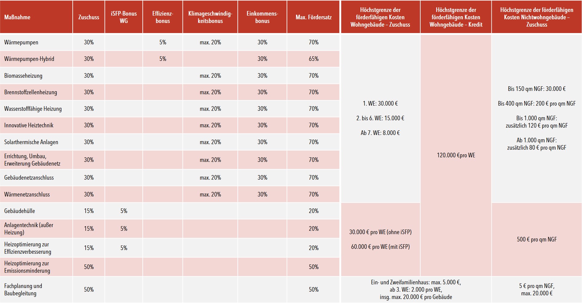 Die Höhe der förderfähigen Investitionskosten werden für die erste Wohneinheit auf 30.000 EUR, für die zweite bis sechste auf 15.000 EUR und 8.000 EUR ab der siebten Wohneinheit begrenzt. Die einzelnen Fördersätze dürfen kumuliert werden, jedoch wird die Summe auf 35 % (Grundförderung mit 5% Wärmepumpen-Bonus) begrenzt. Nur Eigentümer, die ihr Gebäude selbst nutzen, haben die Möglichkeit, über den Einkommens- und Klimageschwindigkeits-Bonus die maximale Förderhöhe von bis zu 70 % zu erreichen.