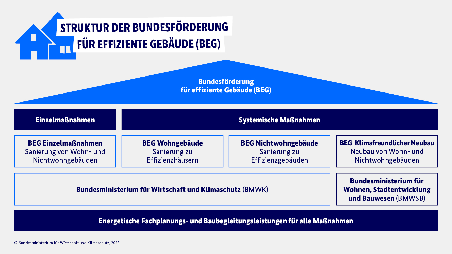 An der bisherigen Grundstruktur der Förderrichtlinien wurde im Kern festgehalten. Unverändert bleibt die Unterteilung in Systemische Maßnahmen (BEG WG/NWG) und Einzelmaßnahmen (BEG EM). Für Neubauten gilt weiterhin die Richtlinie „Klimafreundlicher Neubau“ (KfN).