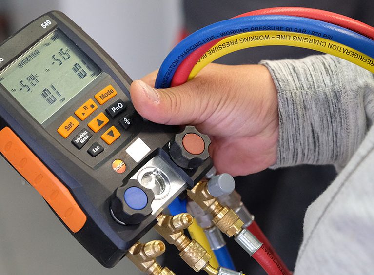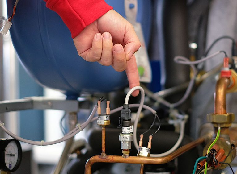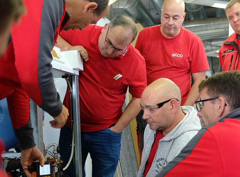 Die Nachmittagsstunden werden genau dazu genutzt. An einer Luft-Wasser-Wärmepumpe darf jeder der Schulungsteilnehmer einen simulierten Störungsfall lösen. Nicht immer gelingt das auf Anhieb. Aber in der Gruppe wird stets eine Lösung gefunden. Mit verschiedenen technischen Hilfsmitteln – es werden Temperaturen und Drücke auf die Nachkommastelle genau gemessen und am Laptop analysiert – identifizieren die ELCO Techniker jede noch so komplizierte Störung.
