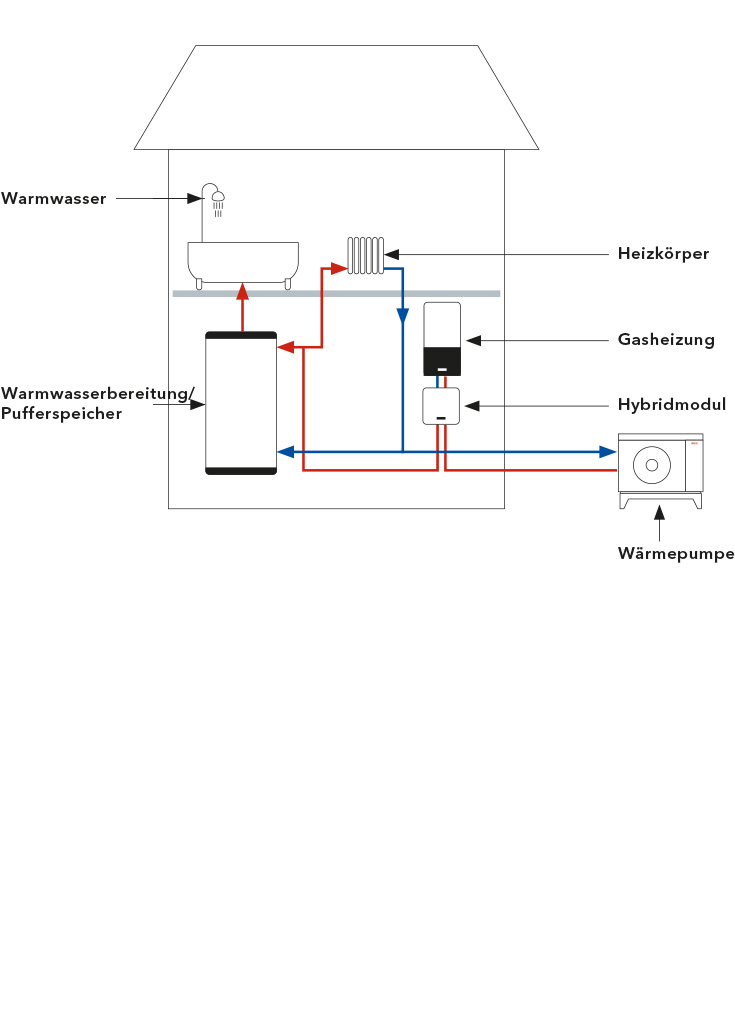 Schematische Darstellung eines ELCO Hybridsystems mit Wärmepumpe und Gas-Brennwertgerät.