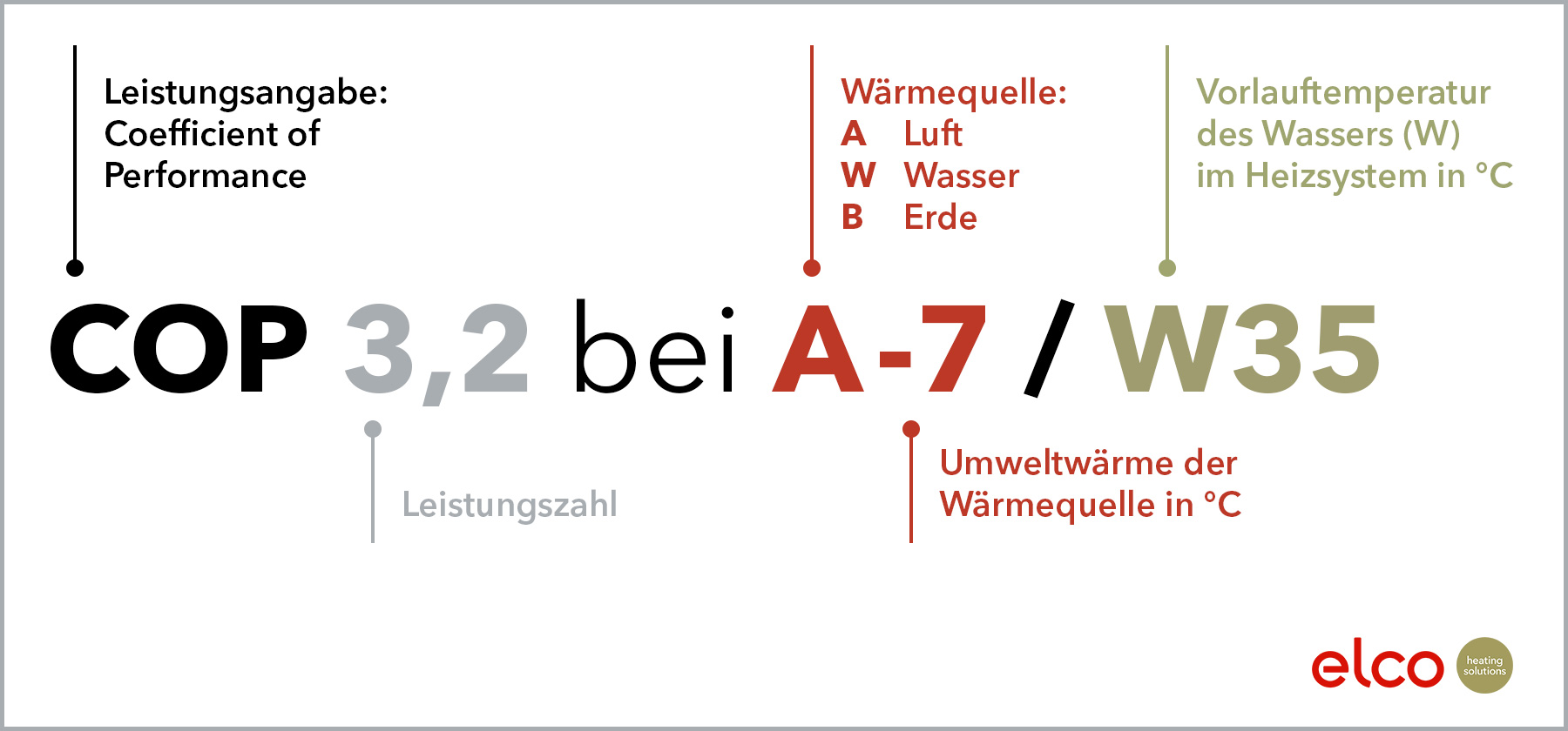 Beim Vergleich des COP verschiedener Modelle ist es wichtig darauf zu achten, dass dies unter den gleichen Voraussetzungen geschieht. So geben viele Hersteller für ihre Luftwärmepumpen den COP bei einer Außentemperatur von +7 °C und einer Vorlauftemperatur von 35 °C an (COP A7/W35). Andere Hersteller wie ELCO hingegen führen die Messung bei -7 °C durch (COP A-7/W35) und damit bei deutlich kälteren Temperaturen. Das zeigt, dass sich die angegebenen Werte nicht ohne Weiteres vergleichen lassen: Ein COP von 3,5 bei A-7/W35 kann in der Praxis effizienter sein als ein COP von 4,5 bei A7/W35, weil das Gerät auch unter deutlich ungünstigeren Bedingungen noch stabil arbeitet. Entscheidend ist daher immer, welche Prüfbedingungen hinter der Zahl stehen.