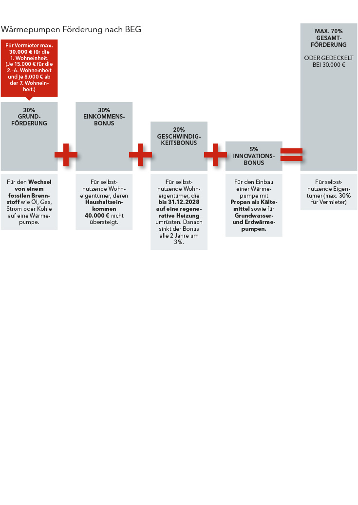 Das Fundament bildet eine Grundförderung von 30 Prozent. Diese gilt sowohl für Wohn- als auch für Nichtwohngebäude und kann von Eigentümern, Vermietern, Unternehmen und Organisationen beantragt werden. Diese Grundförderung von 30 Prozent lässt sich durch weitere Boni bis zu einem Fördersatz von maximal 70 Prozent aufstocken. Gleichzeitig sind die förderfähigen Investitionskosten für die Anschaffung der neuen Wärmepumpe bei 30.000 Euro gedeckelt. Demnach liegt die höchstmögliche Förderung bei 21.000 Euro (70 Prozent Förderung auf eine maximal förderfähige Investitionssumme von 30.000 Euro).