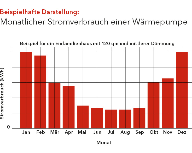 Im Frühjahr und Herbst - bei milderen Temperaturen - benötigt die Wärmepumpenheizung weniger Strom. Um sich ein realistisches Bild vom Stromverbrauch machen zu können, ist es deshalb sinnvoll, den durchschnittlichen Verbrauch pro Jahr zu betrachten. Eine Kennzahl, die genau das ausdrückt, ist die Jahresarbeitszahl (JAZ).